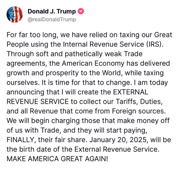 Trump floats the idea of creating the ERS (External Revenue Service) on his Truth Social Account